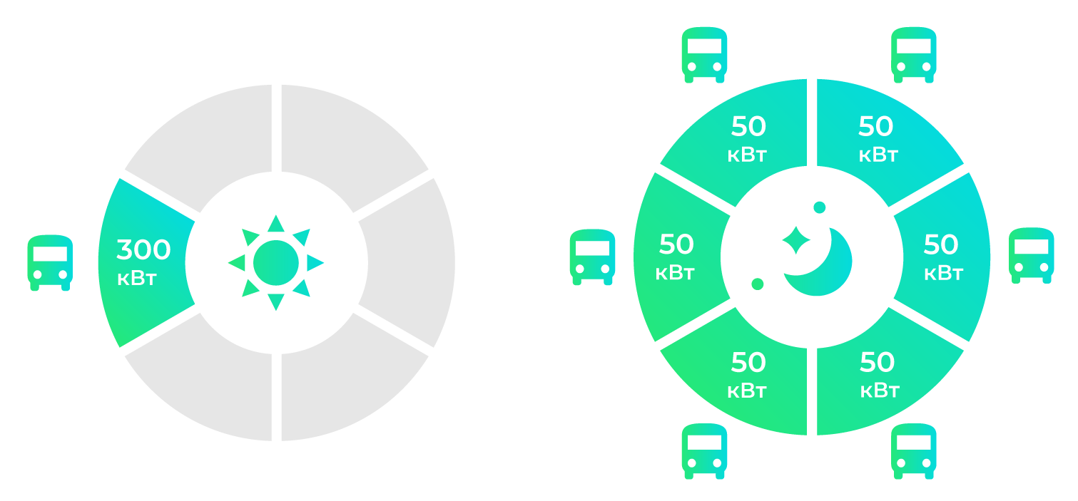 Позволяет днем быстро заряжать на полной мощности один электромобиль, а ночью равномерно распределять электроэнергию по всем транспортным средствам