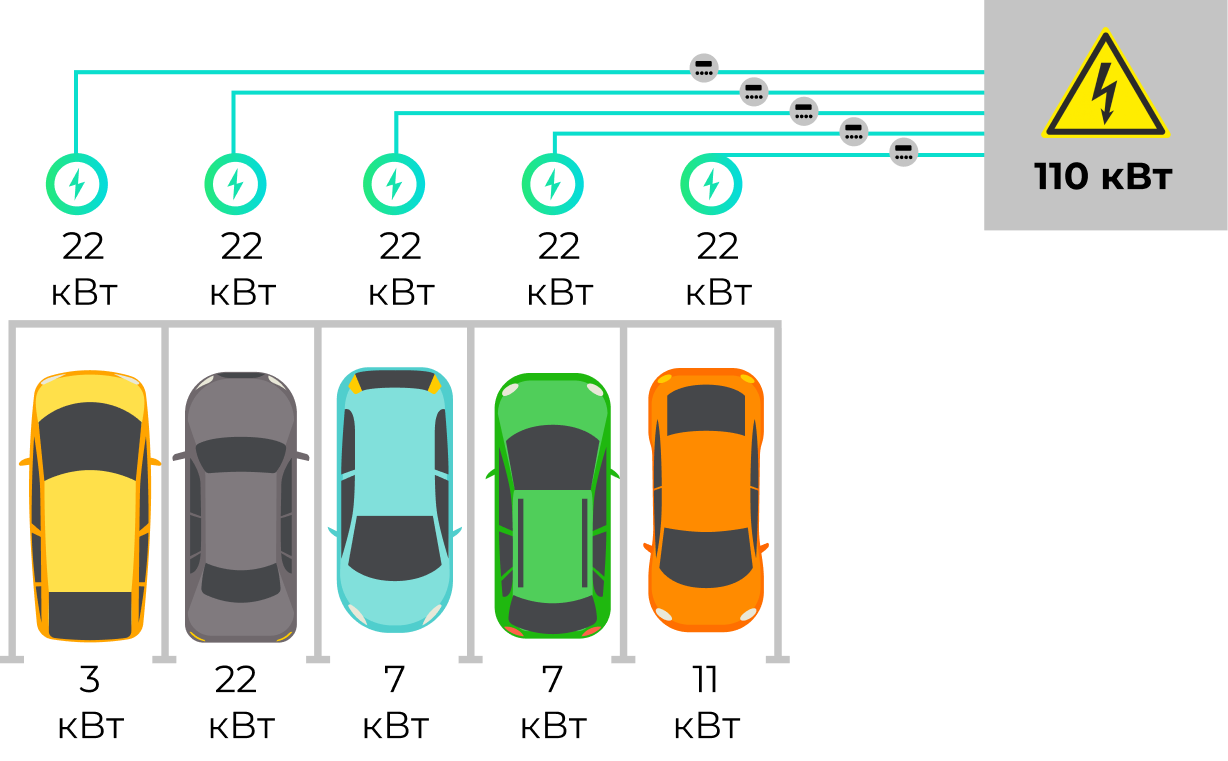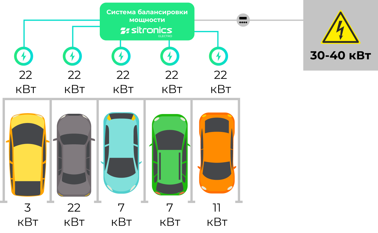 Система балансировки мощности распределяет потоки энергии в зависимости от количества заряжающихся электромобилей и потребляемой мощности отдельно взятого электромобиля. Таким образом, чтобы одновременно зарядить 5 электромобилей переменным током мощностью 22 кВт, понадобится 30-40 кВт вместо 110 кВт
